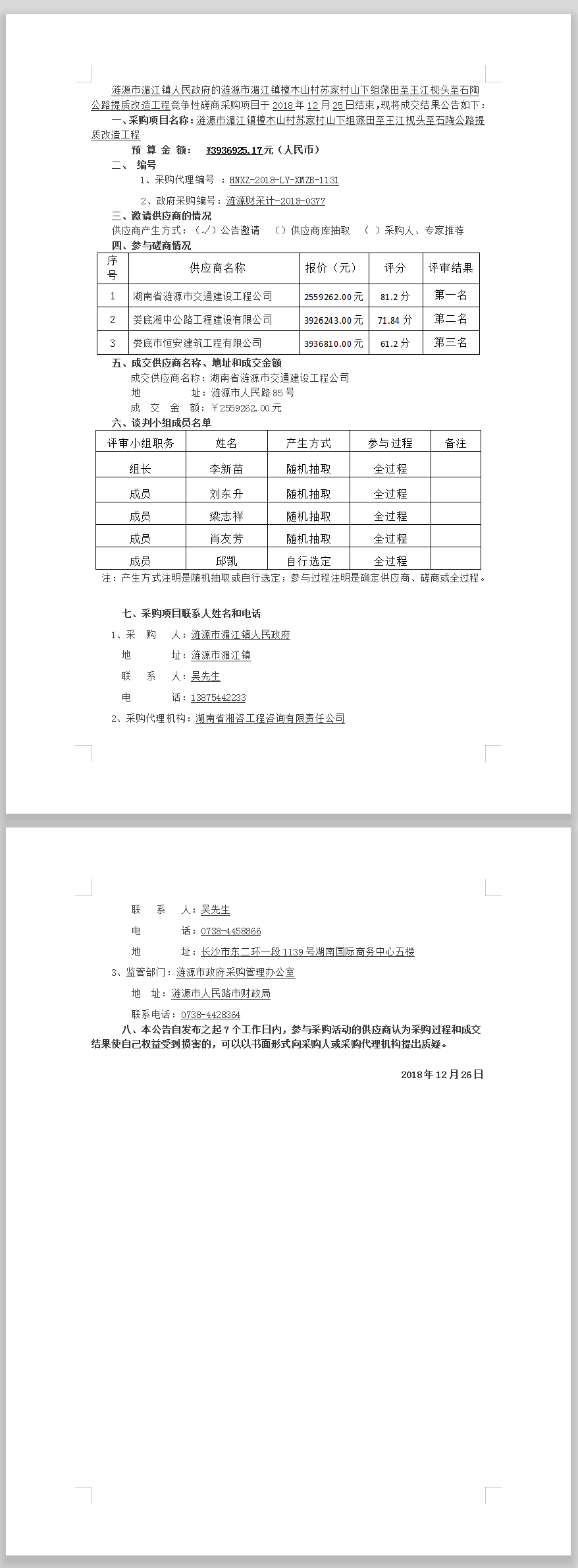 漣源市湄江鎮(zhèn)檀木山村蘇家村山下組蒎田至王江枧頭至石陶公路提質改造工程競爭性磋商成交結果公告