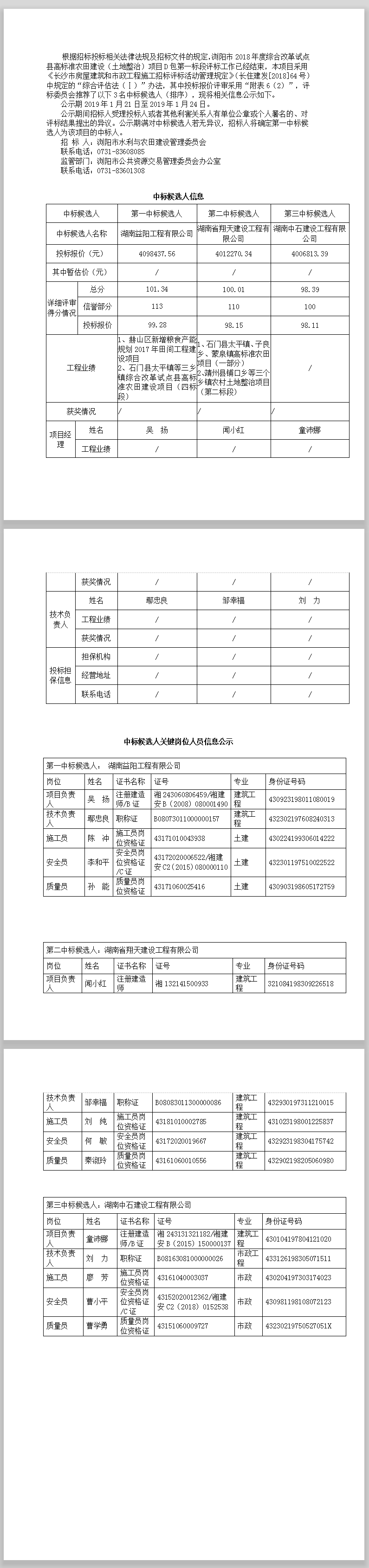 瀏陽市2018年度綜合改革試點(diǎn)縣高標(biāo)準(zhǔn)農(nóng)田建設(shè)(土地整治)項(xiàng)目D包第一標(biāo)段 中標(biāo)候選人公示
