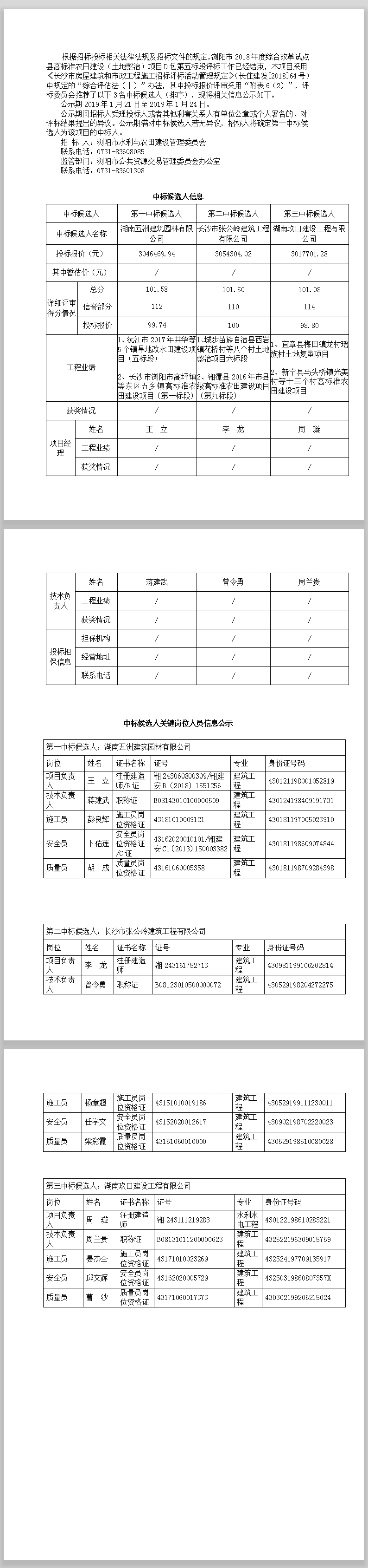 瀏陽市2018年度綜合改革試點縣高標準農(nóng)田建設(土地整治)項目D包第五標段 中標候選人公示