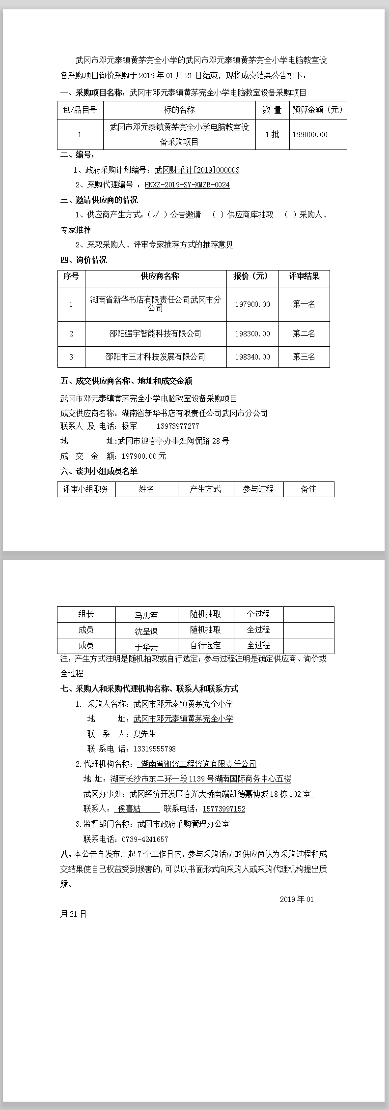 武岡市鄧元泰鎮(zhèn)黃茅完全小學電腦教室設備采購項目詢價成交結果公告