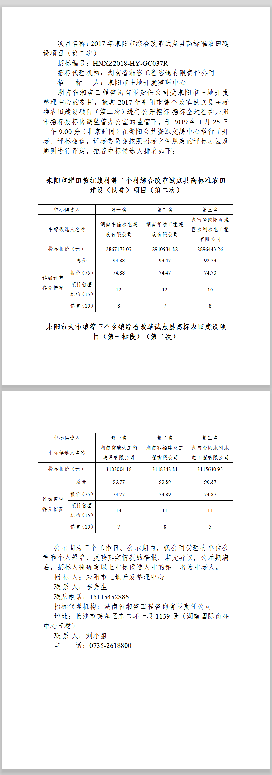 2017年耒陽市綜合改革試點縣高標(biāo)準(zhǔn)農(nóng)田建設(shè)項目(第二次)中標(biāo)候選人公示
