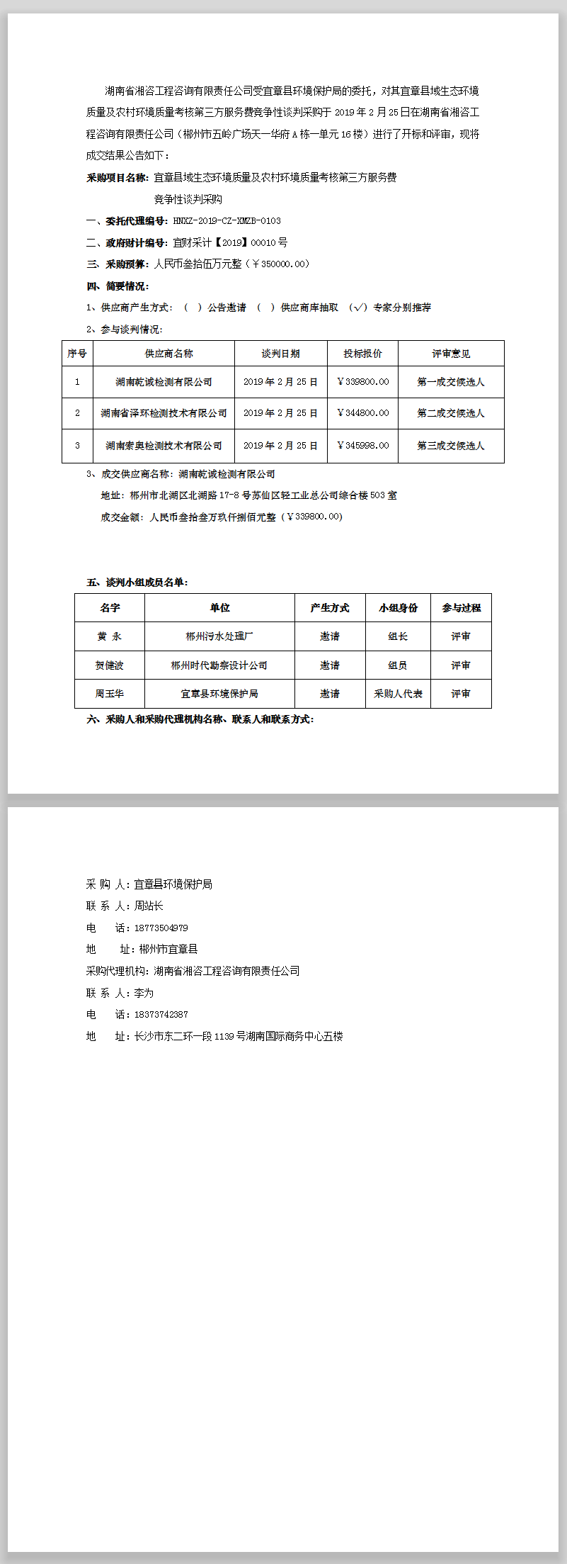 宜章縣域生態(tài)環(huán)境質(zhì)量及農(nóng)村環(huán)境質(zhì)量考核第三方服務(wù)費(fèi)競爭性談判采購成交公告