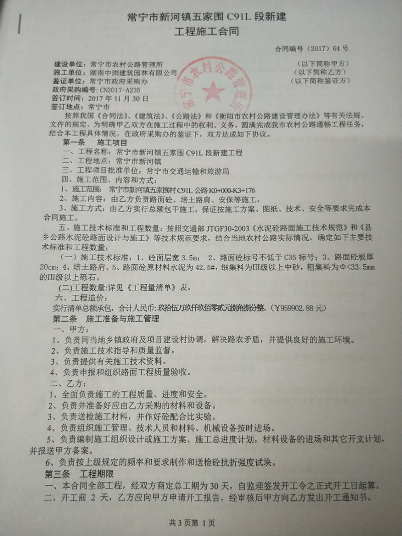 常寧市新河鎮(zhèn)五家圍村C91L段新建工程合同公示