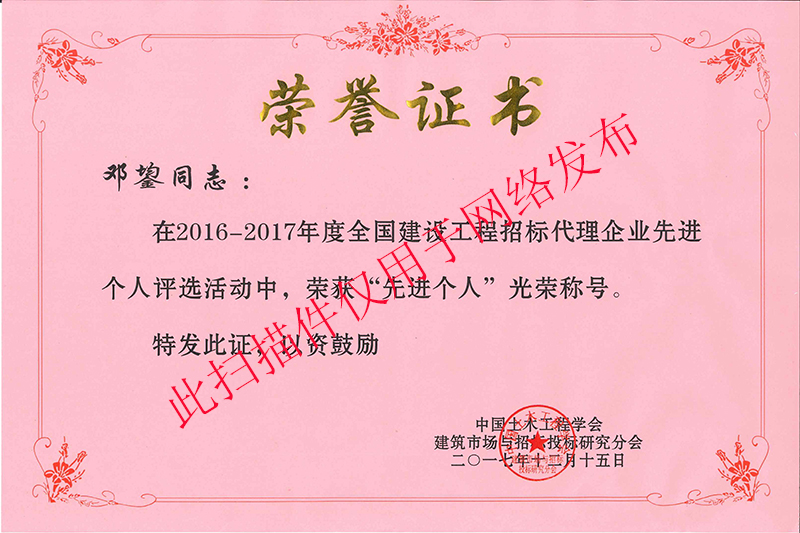 公司鄧鋆總經(jīng)理獲得中國土木工程學會建筑市場與招標投標研究分會頒發(fā)的2017年度全國建設工程招標代理企業(yè)先進個人稱號