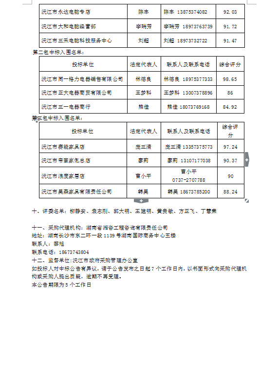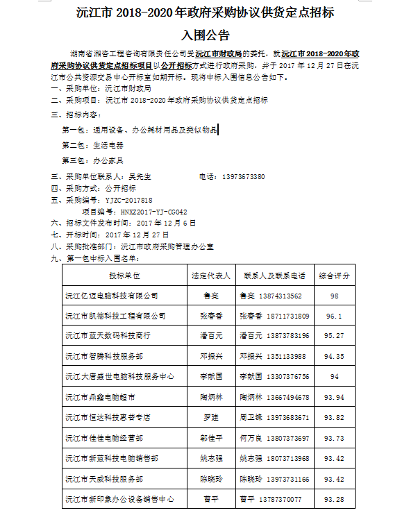 沅江市2018-2020年政府采購(gòu)協(xié)議供貨定點(diǎn)招標(biāo) 入圍公告