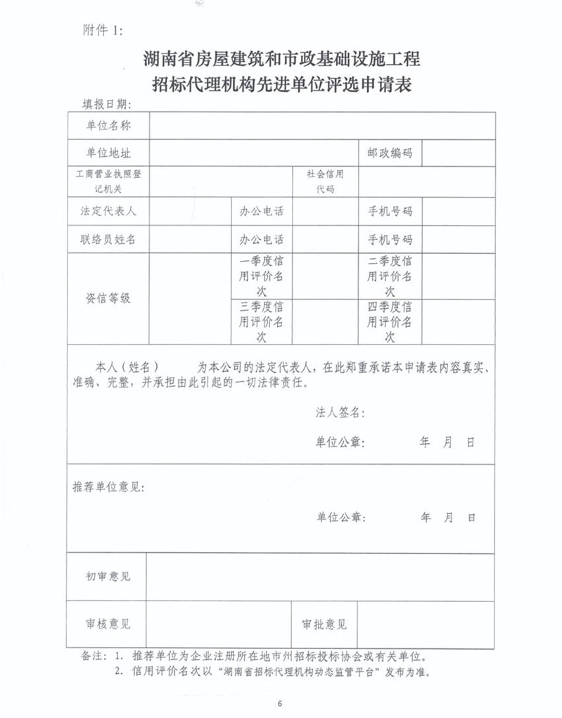 附件1:湖南省房屋建筑和市政基礎(chǔ)設(shè)施工程招標代理機構(gòu)先進單位評選申請表