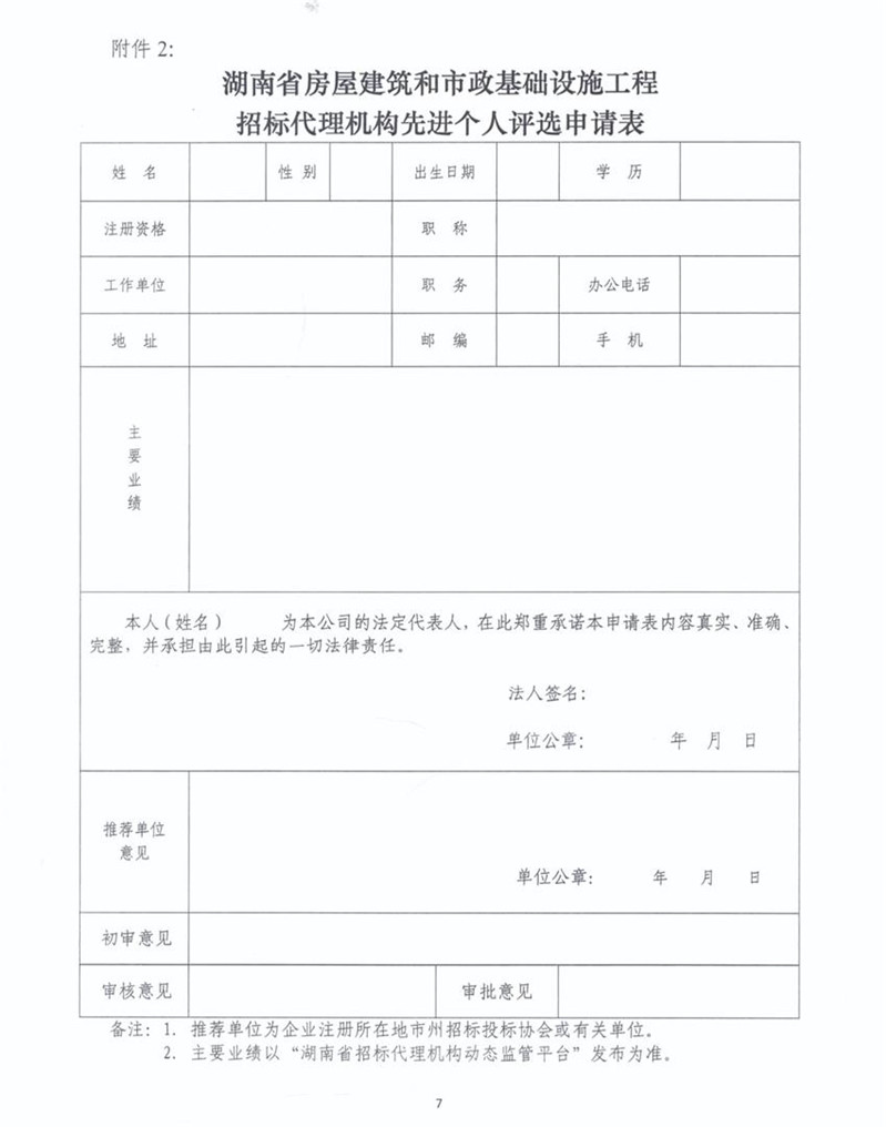 附件2:湖南省房屋建筑和市政基礎(chǔ)設(shè)施工程招標代理機構(gòu)先進個人評選申請表