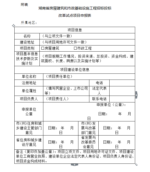 1.申報(bào)材料。項(xiàng)目申報(bào)單位可根據(jù)《試點(diǎn)方案》要求,填寫《湖南省房屋建筑和市政基礎(chǔ)設(shè)施工程招標(biāo)投標(biāo)改革試點(diǎn)項(xiàng)目申報(bào)表》(可在湖南省建設(shè)工程招標(biāo)投標(biāo)網(wǎng)http://www.hnztb.org/自行下載),并將其他相關(guān)材料編制成冊(cè)(一式三份蹋并附全套資料的電子文檔。