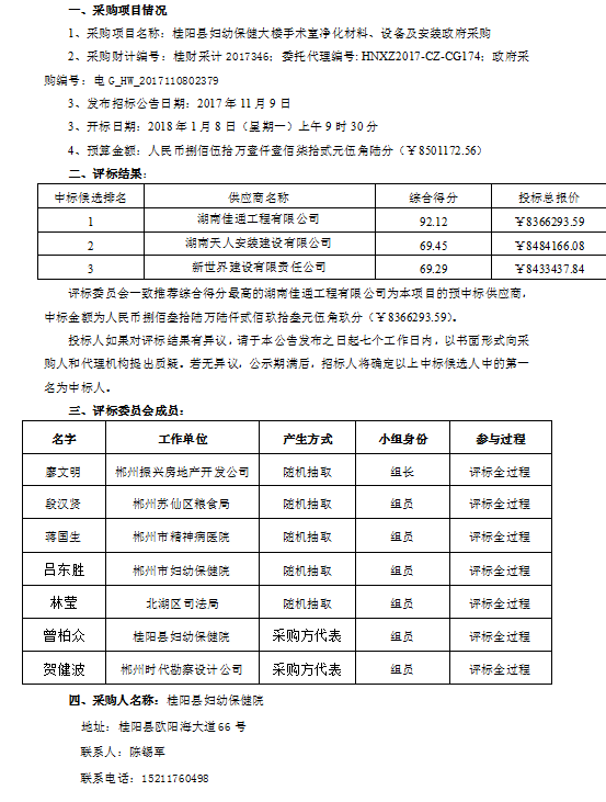 桂陽(yáng)縣婦幼保健大樓手術(shù)室凈化材料、設(shè)備及安裝政府采購(gòu) 評(píng)標(biāo)結(jié)果公示