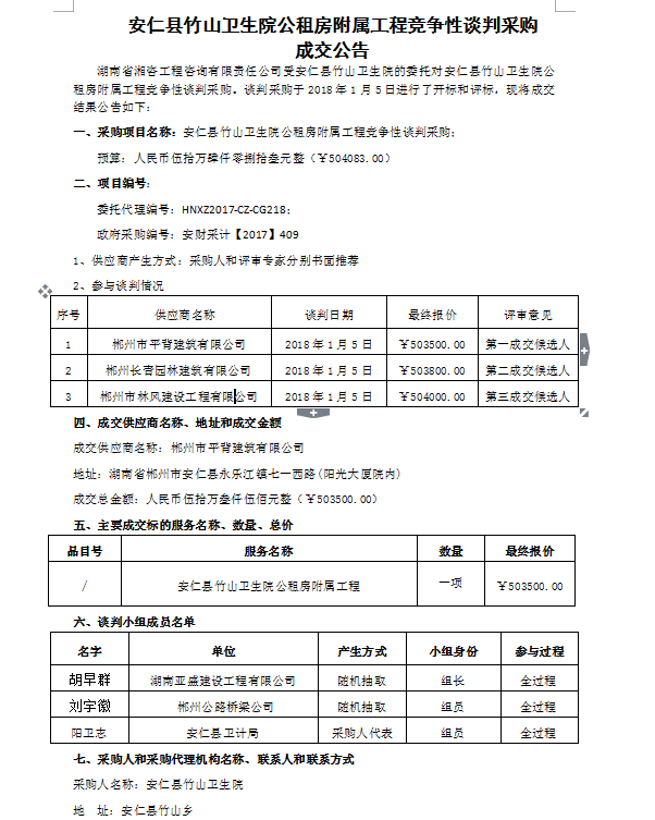 安仁縣竹山衛(wèi)生院公租房附屬工程競爭性談判采購 成交公告