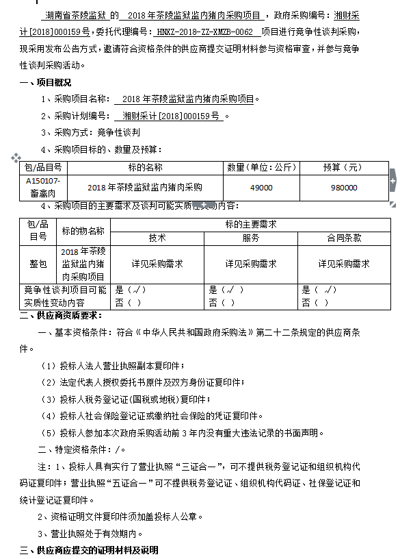 2018年茶陵監(jiān)獄監(jiān)內(nèi)豬肉采購項(xiàng)目招標(biāo)公告