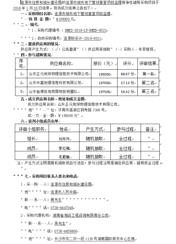漣源市城市地下管線普查項(xiàng)目監(jiān)理競(jìng)爭(zhēng)性磋商 成交結(jié)果公告