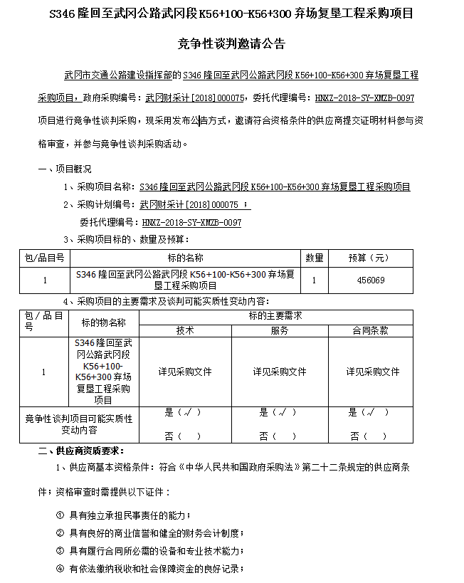 S346隆回至武岡公路武岡段K56+100-K56+300棄場復(fù)墾工程采購項目 競爭性談判邀請公告