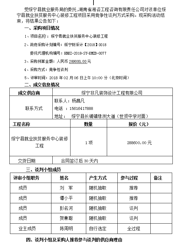 綏寧縣就業(yè)扶貧服務(wù)中心裝修工程談判成交公告