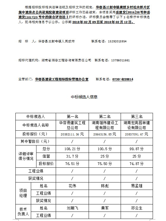 華容縣三封寺鎮(zhèn)美麗鄉(xiāng)村松木橋片區(qū)集中建房點(diǎn)公共設(shè)施配套建設(shè)項目中標(biāo)候選人公示