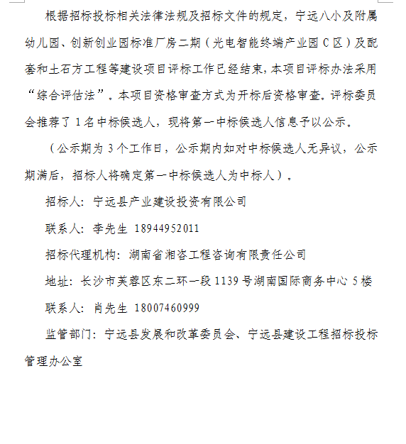 寧遠八小及附屬幼兒園、創(chuàng)新創(chuàng)業(yè)園標準廠房二期(光電智能終端產(chǎn)業(yè)園C區(qū))及配套和土石方工程等建設項目中標候選人信息公示