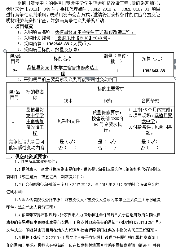 桑植縣賀龍中學(xué)學(xué)生宿舍維修改造工程 競爭性談判邀請公告