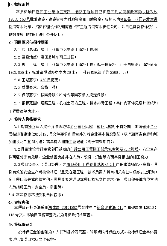 隆回工業(yè)集中區(qū)支路1道路工程項目招標公告