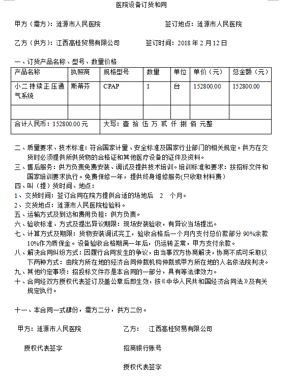 漣源市人民醫(yī)院小兒專用無創(chuàng)呼吸機(jī)采購合同