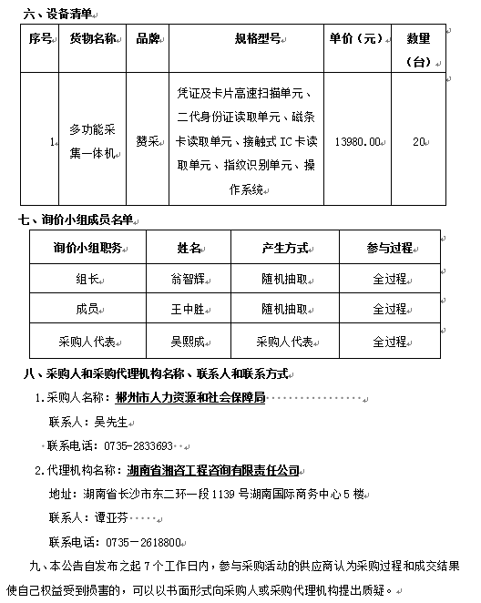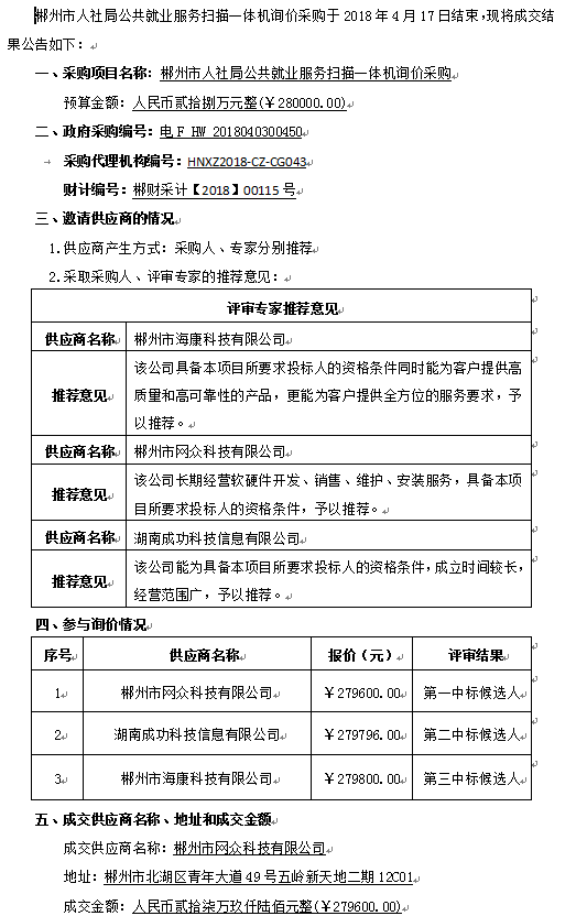 郴州市人社局公共就業(yè)服務掃描一體機詢價采購成交結果公告