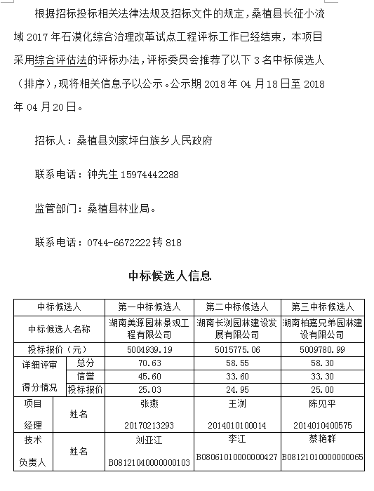 桑植縣長(zhǎng)征小流域2017年石漠化綜合治理改革試點(diǎn)工程中標(biāo)候選人公示