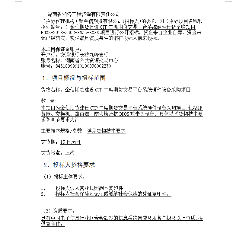 金信期貨建設(shè)CTP二席期貨交易平臺(tái)系統(tǒng)硬件設(shè)備采購(gòu)項(xiàng)目投標(biāo)邀請(qǐng)