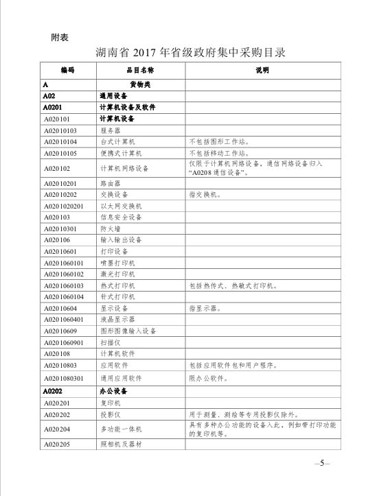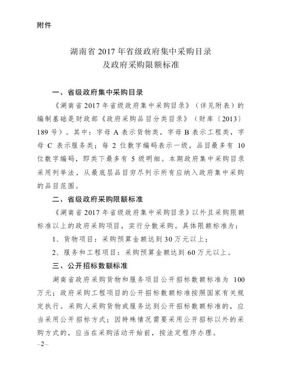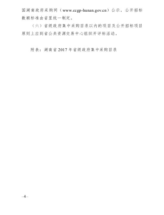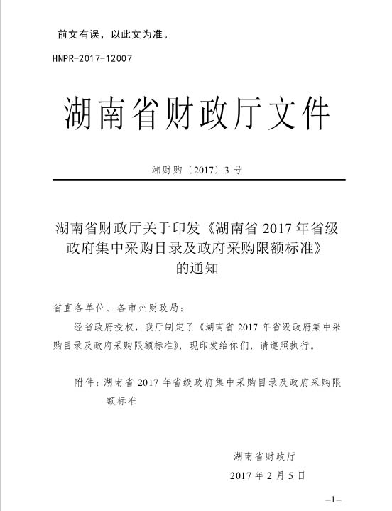 湖南省財(cái)政廳關(guān)于印發(fā)《湖南省2017年省級政府集中采購目錄以及政府采購限額標(biāo)準(zhǔn)》的通知