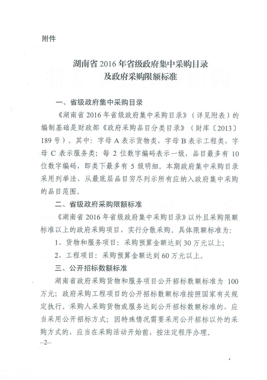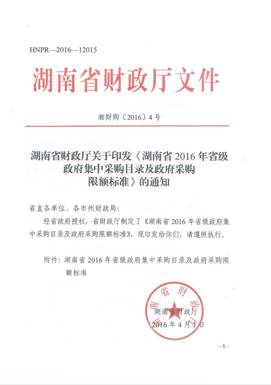 湖南省財政廳關(guān)于印發(fā)《湖南省2016年省級政府集中采購目錄及政府采購限額標(biāo)準(zhǔn)》的通知