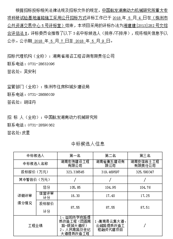 中國航發(fā)湖南動力機(jī)械研究所重大專項科研試驗基地道路施工 招標(biāo)投標(biāo)信息公示表